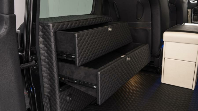Внутри – царство эксклюзивной кожи со столиками, потайными отделениями и даже с кофеваркой.