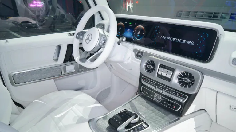 І якщо зовнішніх відмінностей доволі багато, то інтер’єр Concept EQG повністю запозичив у базової моделі. Тут такі ж з’єднані в цілісний блок цифрова приладова панель і екран мультимедіа.