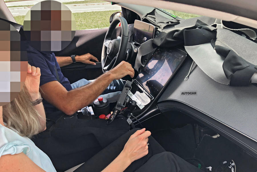 У салоні схожість із Mercedes S-Class куди більша. Тут виробник розмістив 11,9-дюймовий центральний тачскрін і 12,3-дюймову цифрову панель приладів. Про інші елементи інтер’єру поки що говорити зарано. Вони, як і раніше, приховані під камуфляжем.