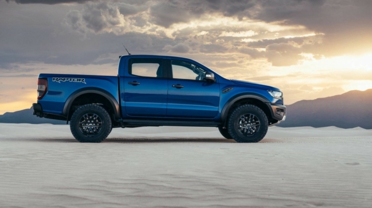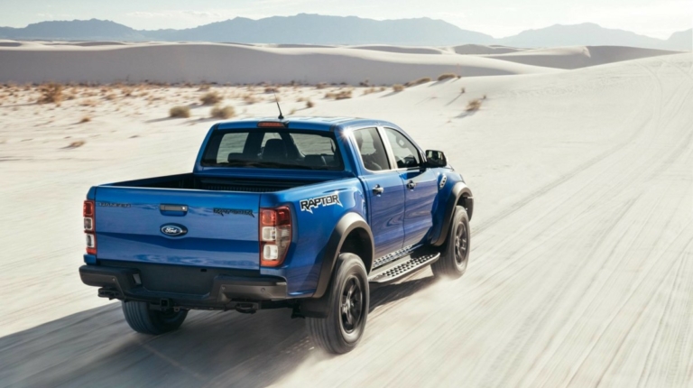 Отличить новый Ford Ranger Raptor можно по измененной решетке радиатора, новым подножкам и скошенным снизу бамперам. Расширенные колесные арки указывают на увеличенную колею. Дорожный просвет вырос до 283 мм, угол въезда – до 32,5°, а съезда – до 24°.