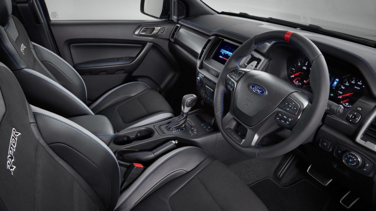 В интерьере обращают на себя внимание спортивные сиденья с контрастной прострочкой и обшитый перфорированной кожей обод руля. Кроме того, пикап Форд получил измененную панель приборов.