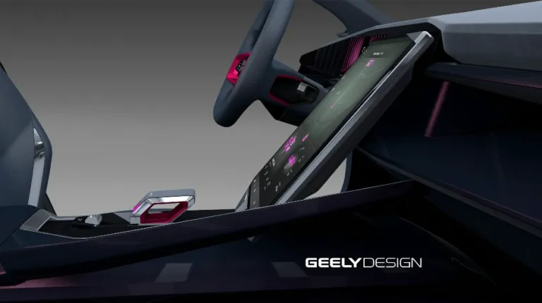 Салон Geely Vision Starburst витриманий у тій самій стилістиці. Всередині встановлено масивне кермове колесо з невеликим екраном у центрі, цифрова приладова панель і мультимедійна система з вертикально орієнтованим монітором. Селектор трансмісії складної геометричної форми, розташований на “летючій” центральній консолі, ідеально вписується в загальну концепцію.