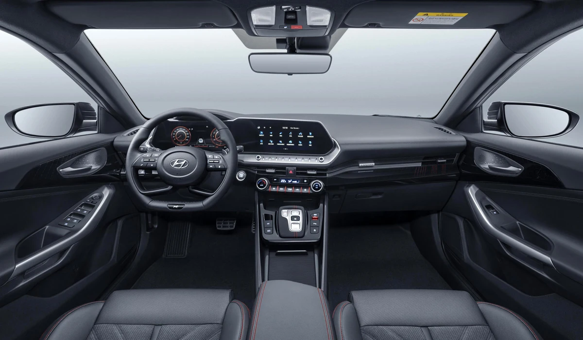 У салоні — червоні акценти на передній панелі, спортивні сидіння з червоним декоративним рядком та такого ж кольору кнопка активації спортивного їздового режиму. У стандартній комплектації два 10,25-дюймові дисплеї — панель приладів та мультимедійка. Блок клімат-контролю залишився аналоговим. Перемикання коробки передач винесено на новий кнопковий пульт.