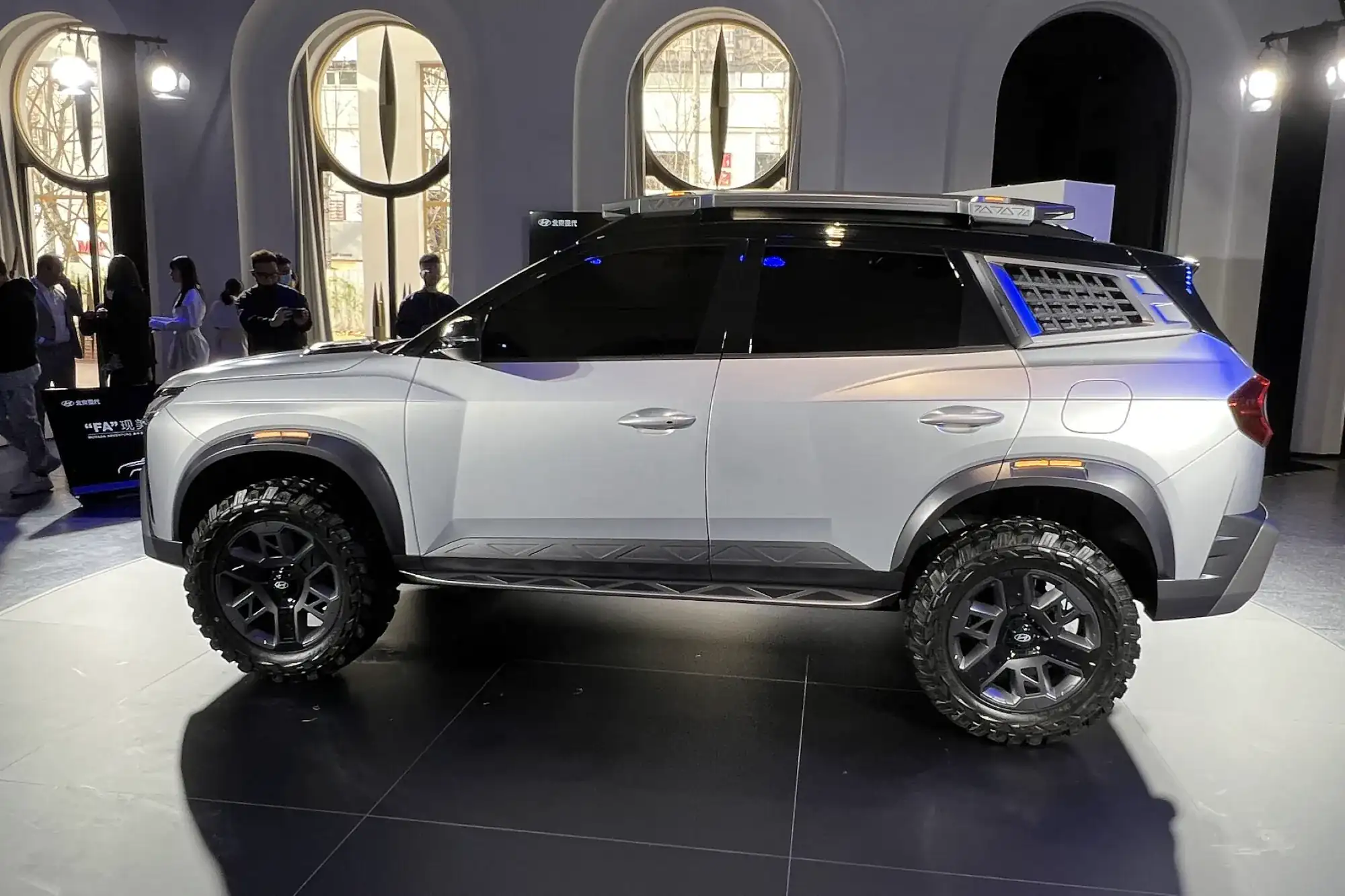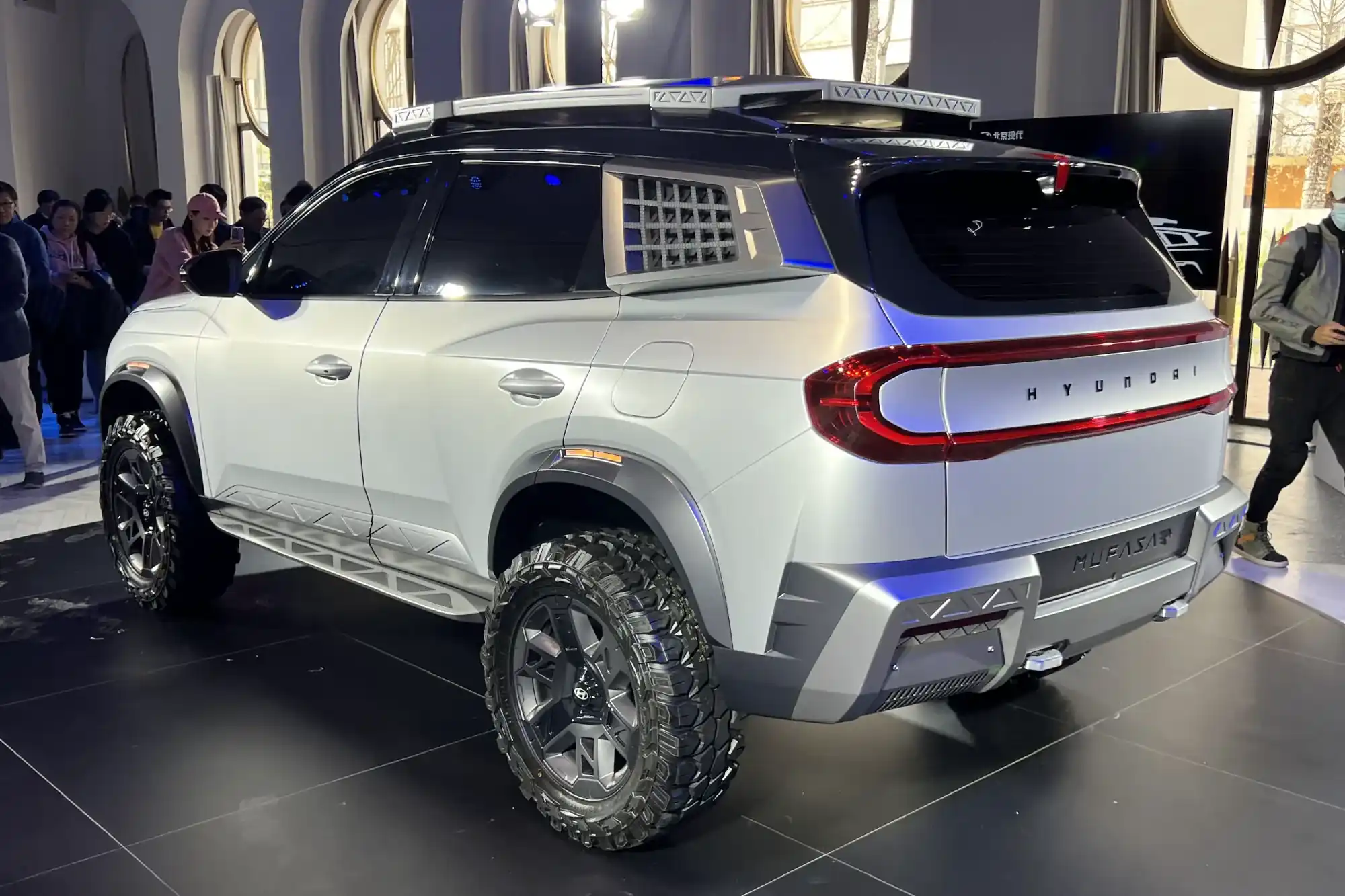 У брутального шоу-кару масивні бампери із буксирувальними проушинами, поручні на кришці капоту, додаткові підніжки та великі колісни диски із позашляховими шинами. На даху — туристичний багажник із додатковою люстрою, а на задніх стійках — грати. Якщо все це відкинути, то отримаємо серійний Hyundai Mufasa, фотографії якої китайський сертифікаційний орган опублікував ще у лютому. Інтер'єр автомобіля так і залишився поза кадром.
