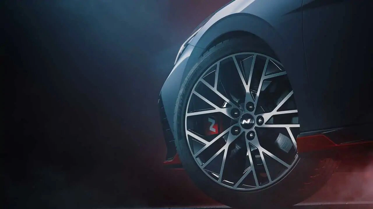 Зараз же настав час перших офіційних зображень. Їх два: на одному видно задню частину нового седана Хюндай з невеликим спойлером на кришці багажника, на другому — колесо з червоним гальмівним супортом і літерою N. Ще одна деталь, на яку звертаєш увагу і яку видно на обох зображеннях — червоні пороги.