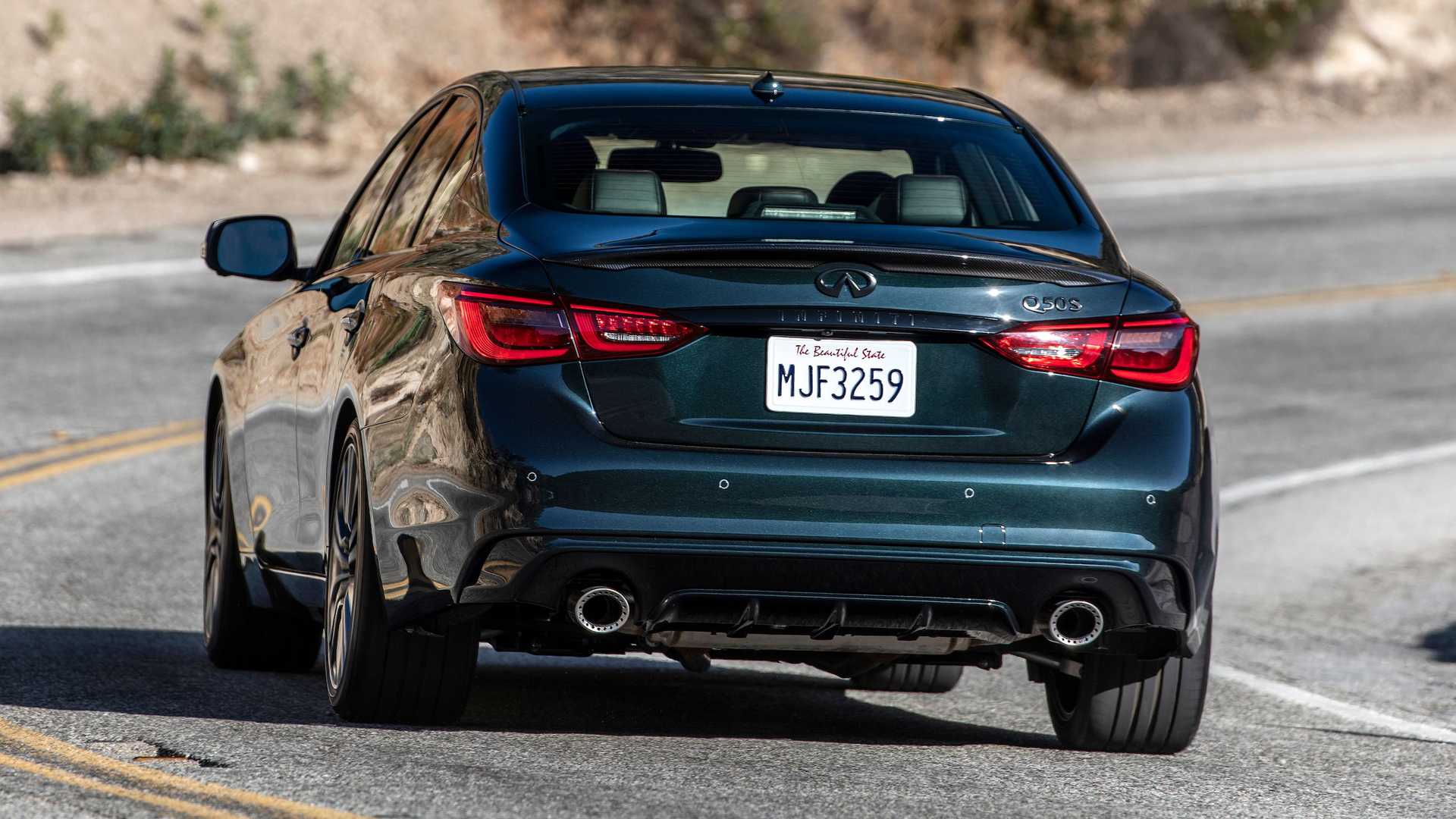 Також особливому Q50 дісталися карбоновий задній спойлер та матово-чорні шильдики й логотипи на кузові. Салон оздоблений чорною шкірою із червоним декоративним рядком, на передніх сидіннях — у вигляді ромбів.