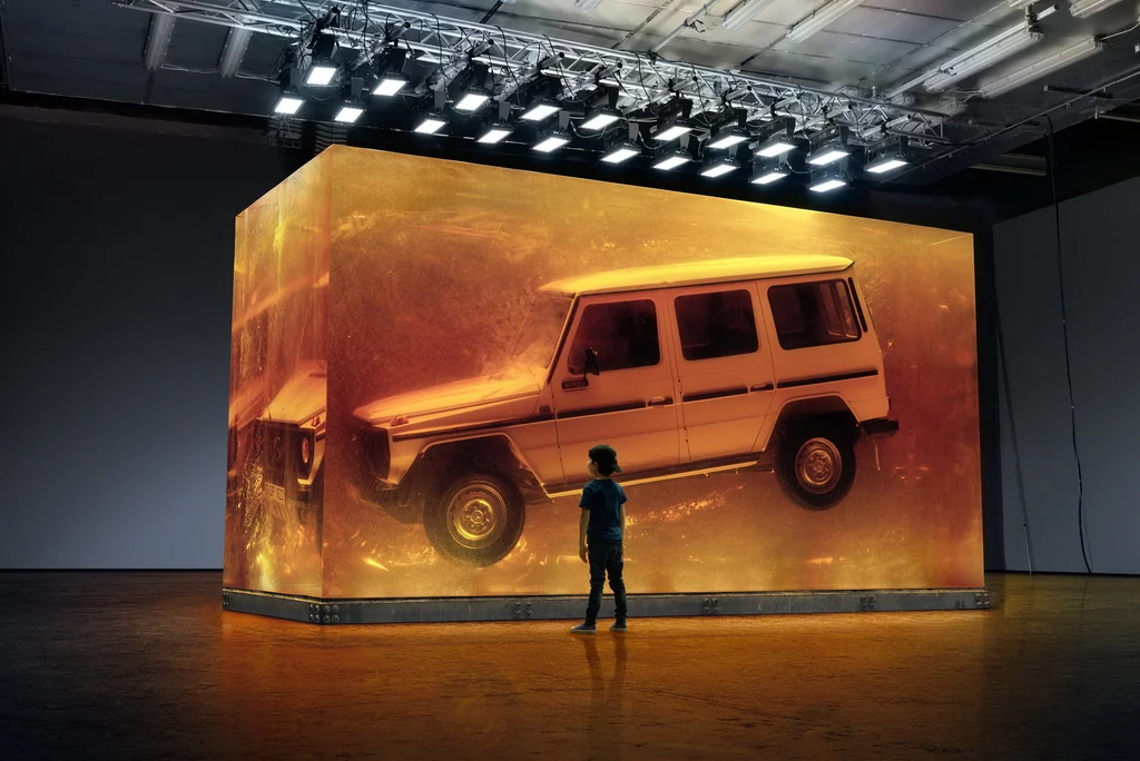 Конструкция из синтетической смолы, напоминающий янтарь, весит 44,4 тонны. Внутри куба разместили Mercedes-Benz G-Class 280 GE 1979 года выпуска, ставшего родоначальником популярного семейства внедорожников. Инсталляция призвана символизировать, что легендарный внедорожник неподвластен времени, подобно насекомым, которые сохранились в природном янтаре.