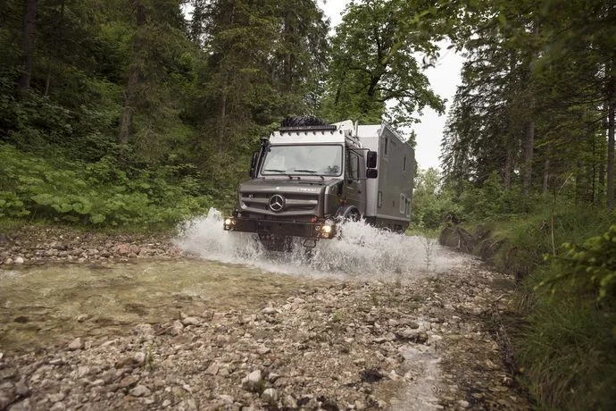 Автодом Mercedes Unimog оснащен 231-сильным турбодизелем с крутящим моментом в 900 Н∙м. У КПП – 8 ступеней для движения вперед и 6 – для заднего года.