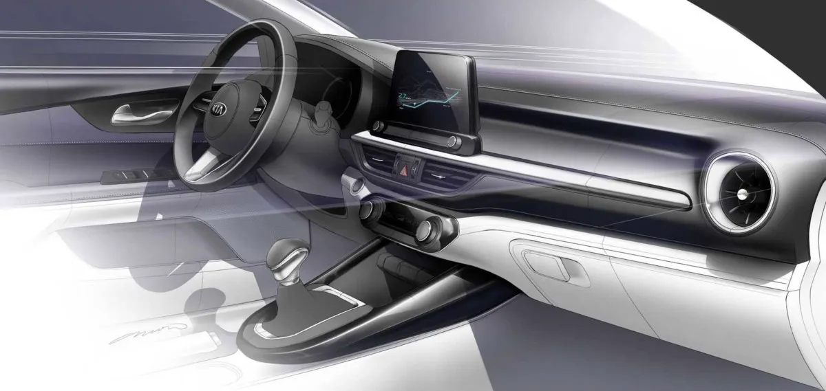 Рендеры интерьера Kia Forte 2019 дают понять, что автомобиль получит большой тачскрин мультимедиа, а количество кнопок на центральной панели будет уменьшено. Дефлекторы системы вентиляции выдержаны в духе флагманского Kia Stinger.