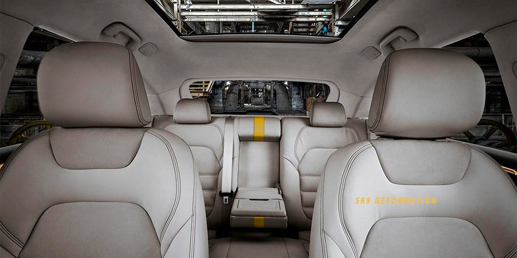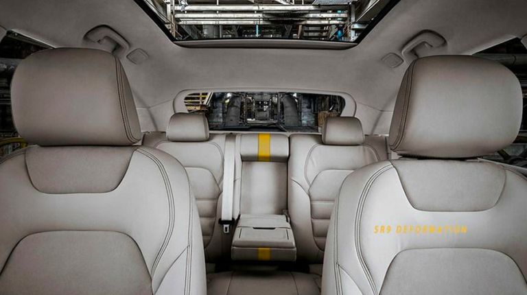 Інтер’єр Zotye SR9 Deformation також індивідуалізований. Шкірою оздоблені не тільки сидіння, а й торпедо. У верхній частині салон оперезаний жовтою смужкою, а перед водієм розміщена повністю електронна приборка. Загалом, по-багатому.