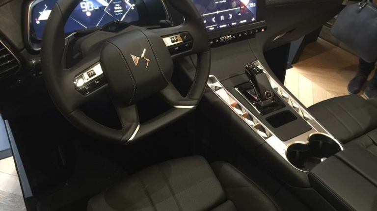 У салоні DS 7 Crossback передбачено віртуальну панель приладів і великий 12-дюймовий сенсорний дисплей мультимедіа. Оригінальна деталь інтер’єру – висувний годинник на центральній панелі.