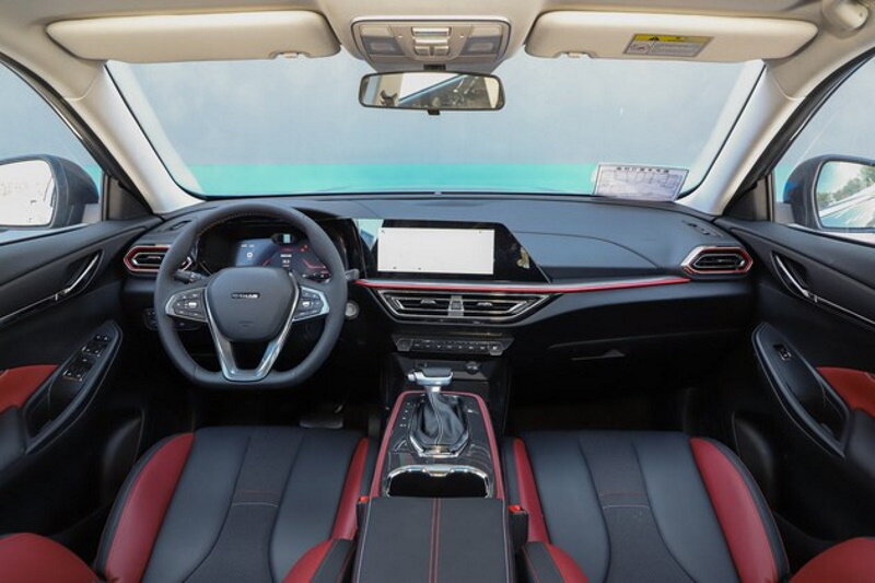 Оформление салона отдаленно намекает на «спортивность» благодаря сочетанию черного и красного оттенков. Место приборной панели досталось дисплею, диагональ которого составляет 10 дюймов. По центру находится тачскрин такого же размера.