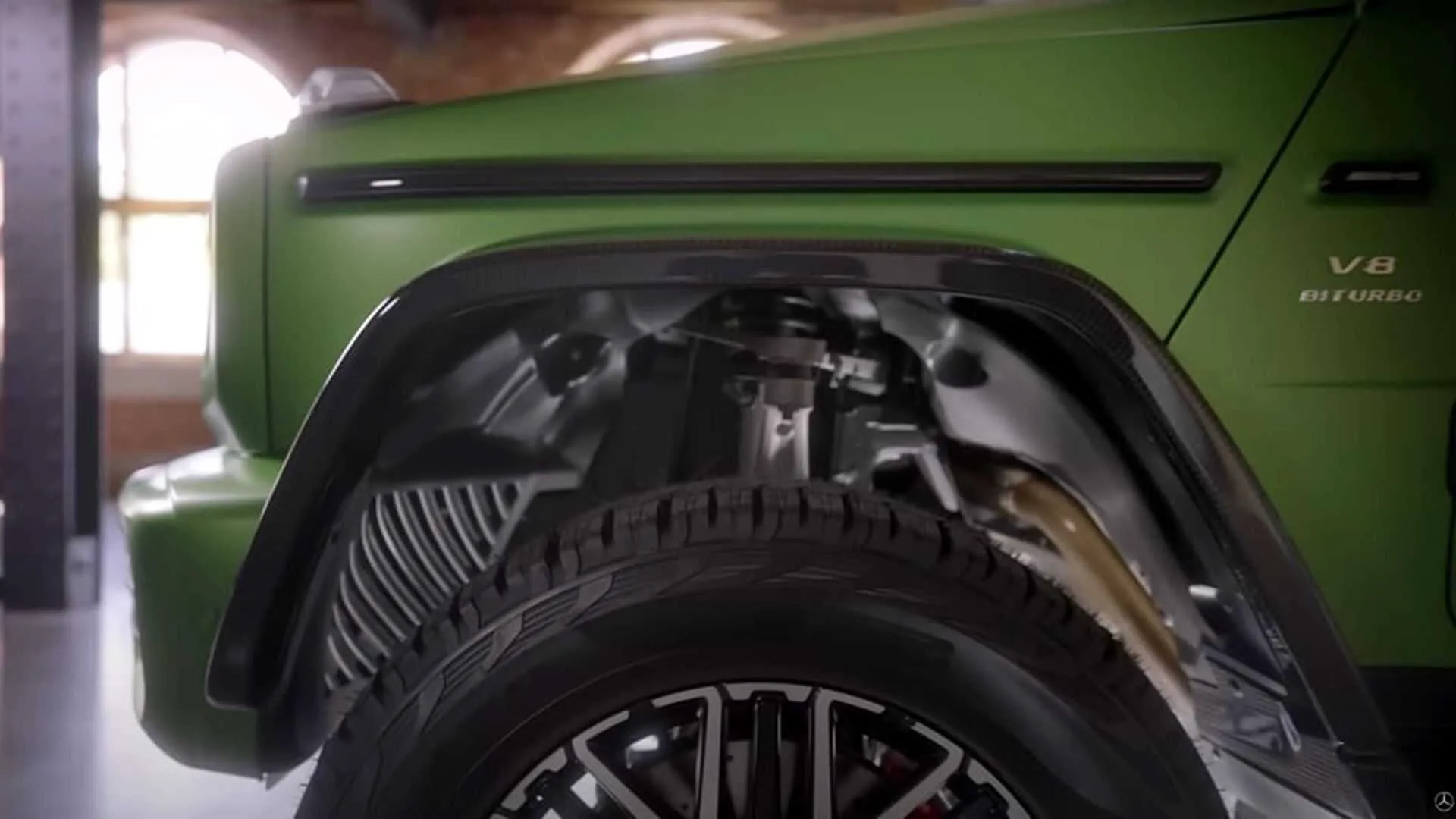 Крім колісних дисків зовні хардкорний G-Wagen відрізняється унікальним карбоновим “спойлером” над вітровим склом зі світлодіодними вогнями дальнього світла. З карбону виготовлені розширювачі колісних арок, опціональний багажник на даху зі сходами і новий тримач запасного колеса з написом 4×4². На кузові матовий і глянцево-чорний декор у поєднанні зі сріблястим хромом. У кузовній палітрі 40 відтінків, матовий Green Hell magno, запозичений у суперкара AMG GT R.