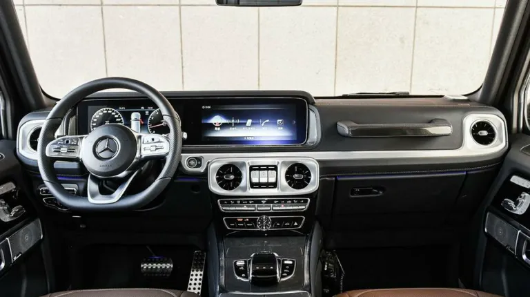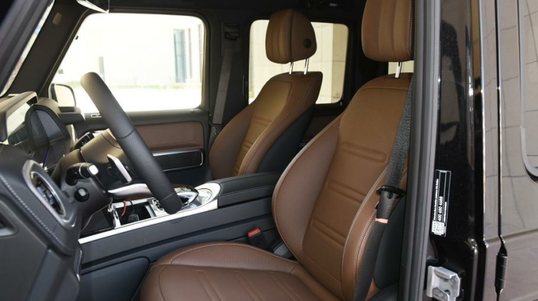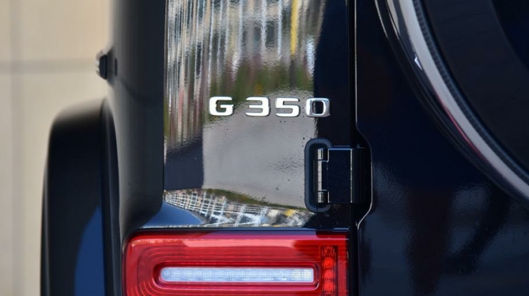 Зрозуміти, що перед вами базовий Mercedes G 350 не складно. Від звичної версії він відрізняється відсутністю шильдика на п’ятих дверях і логотипу V8 на передніх крилах. В оснащенні виробник нічого міняти не став. Майбутнім власникам доступні мультимедіа, аудіосистема з 16 динаміками, крісла з підігрівом, вмонтованою вентиляцією і функцією масажу, особливе підсвічування салону і повний набір систем безпеки.