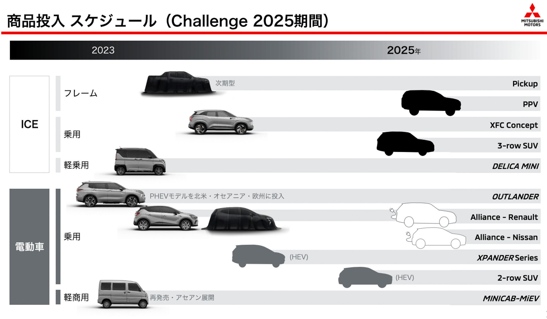 Mitsubishi Motors (MMC) озвучила плани розвитку модельної лінійки. Як повідомляється, на 2023 рік заплановано шість нових моделей. Дві з них — кросовер ASX для Європи та позашляховий кей-кар Delica Mini для Японії — вже дебютували. До кінця року до них приєднаються пікап Mitsubishi Triton/L200 нового покоління, гольф-кар Mitsubishi Colt та гібридна версія мінівену Xpander.