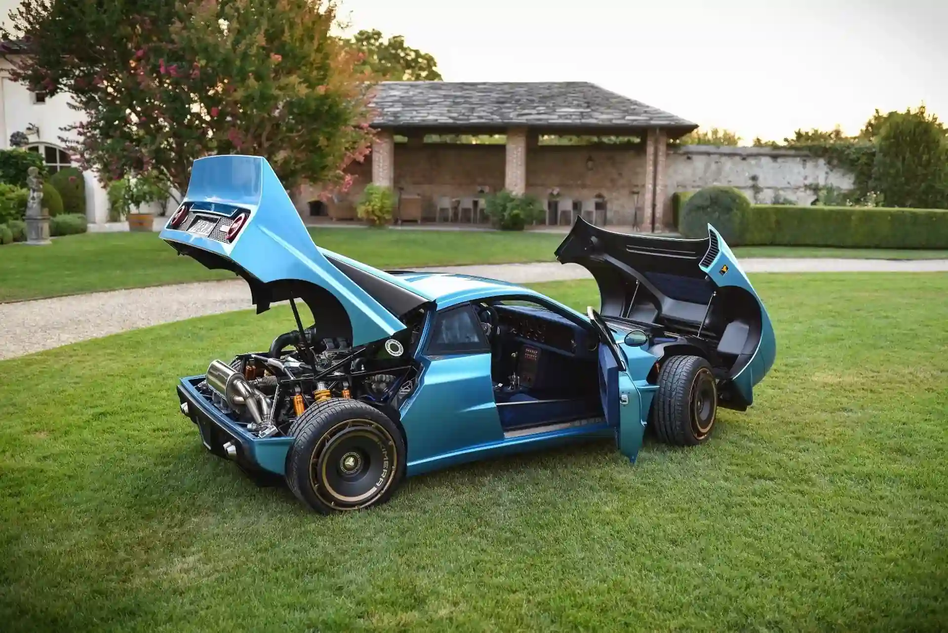 Від легендарного ралі-кара групи B з 80-х Kimera EVO3 успадкував не лише зовнішність — він відкривається як трансформер. Передня та задня частини кузова рестомода — цілісні конструкції, які піднімаються вгору. Невипадково обрано й колір кузова. Це характерний для американських гоночних болідів відтінок синього.
