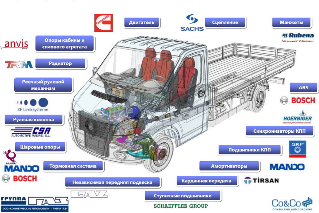 В конструкции «Газель Next» применяются многочисленные комплектующие производства зарубежных компаний с мировым именем. Но сделано это выборочно, если не сказать – точечно. Их используют в самых ответственных узлах, там, где малейшая вероятность отказа приведет к снижению надежности автомобиля в целом. Полное представление о широте «импортного набора» компонентов для новинки ГАЗа дадут представленные здесь схемы. В то же время, никто не отменял стремления максимально снизить себестоимость автомобиля.