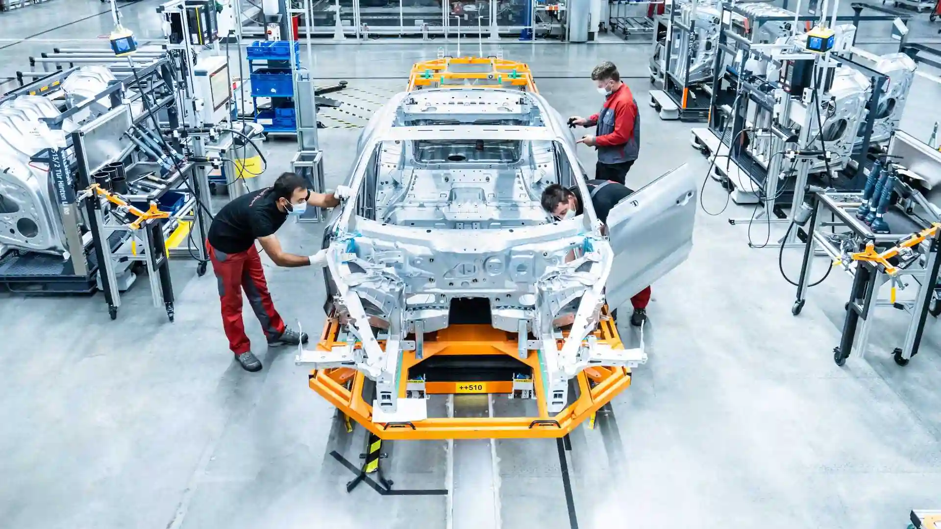 В процессе подготовки производства Audi e-tron GT предприятие по мелкосерийной сборе прошло полную модернизацию. Как сообщается, кузовные работы автоматизированы на 85 %. Для этого на заводе установили новый подвесной конвейер и 34 робота.