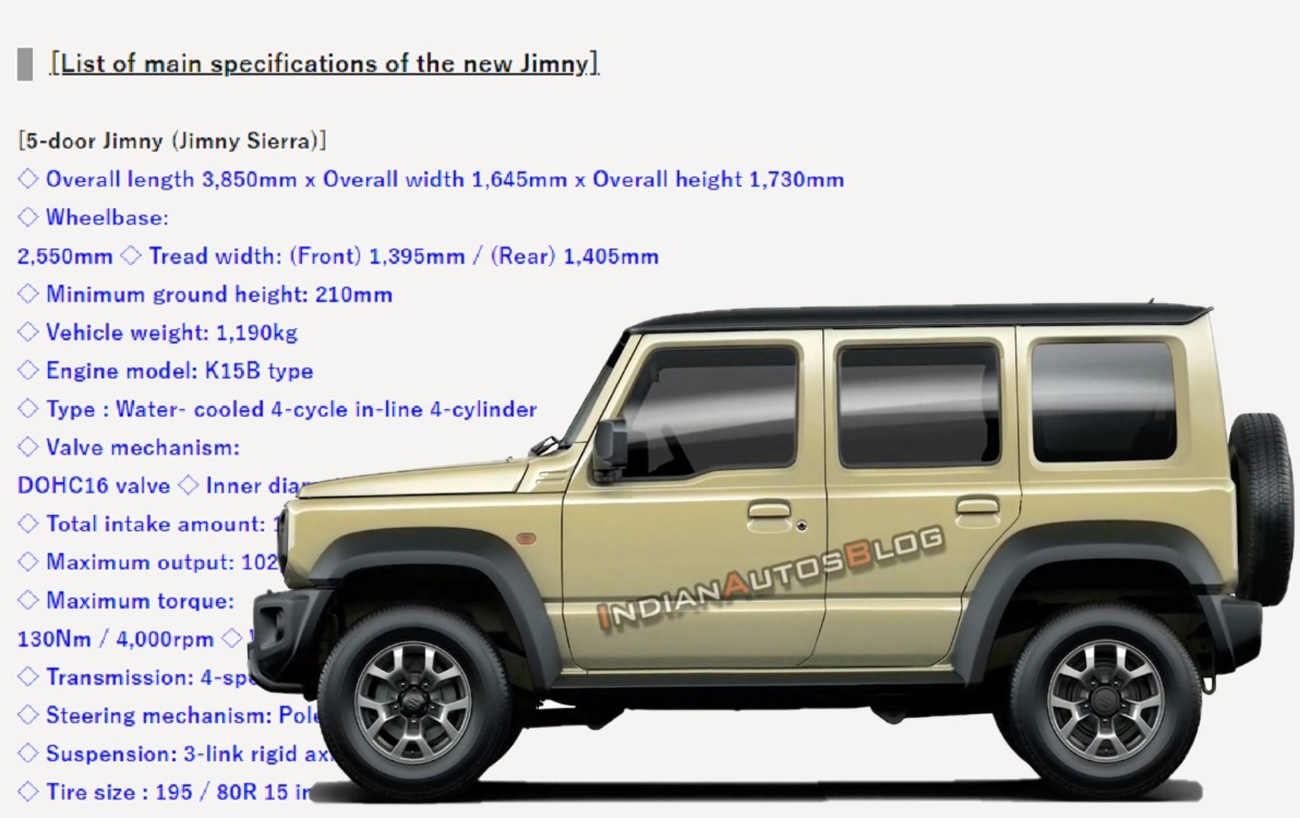 Свежая информация о новинке стала известна благодаря Indianautosblog, который в числе первых опубликовал несколько рендеров пятидверного Сузуки Джимни, сопроводив их информацией о моторах. Одним из них станет 1,4-литровый 127-сильный турбированный двигатель от Suzuki Swift Sport. Такой мотор будет сопряжен с пятиступенчатой механической или четырехступенчатой автоматической коробкой передач. Привод – полный.