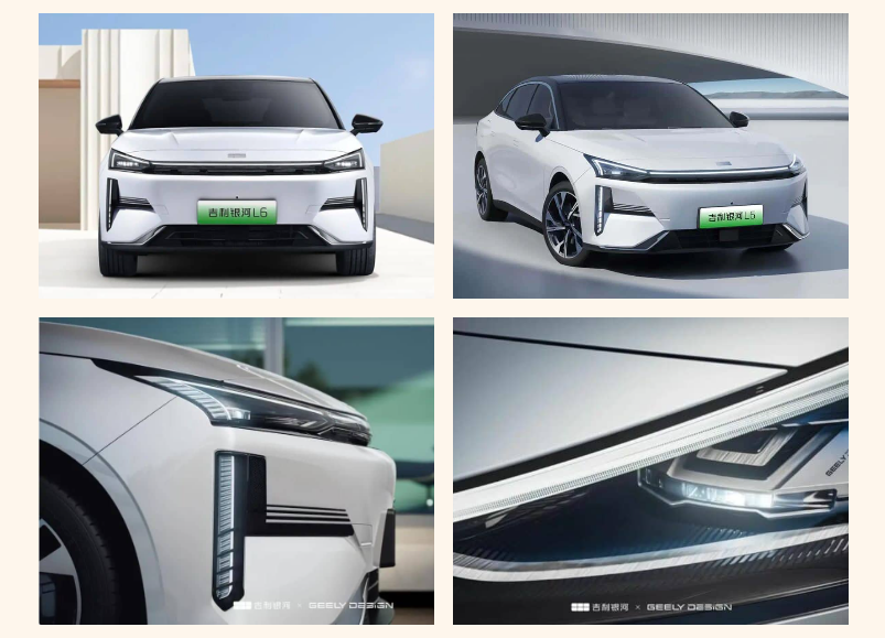 Geely опублікувала офіційні фото другої моделі суббренду Galaxy — «розеткового» гібриду L6. Екстер’єр новинки розроблений у стилістиці кросовера Galaxy L7. Зокрема, у седана такі самі вертикальні світлові смуги з боків від закритої передньої панелі. Особливо цікаво виглядають характерні кутасті фари, з’єднані тонкою смужкою, що світиться. Ще одна особливість — новий логотип бренду Galaxy у вигляді шести сріблястих прямокутних елементів на капоті.