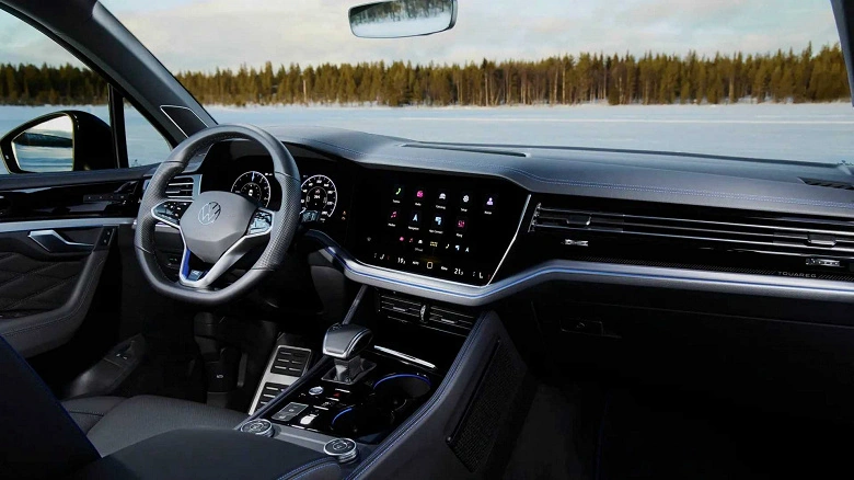 Плагін-гібридна версія виділятиметься синіми гальмівними супортами із маркуванням R. Корму такого Touareg прикрашають значком «VW» із підсвіткою та сполучені світлодіодною смугою ліхтарі.