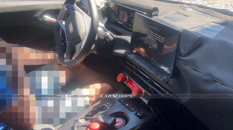 На знімках видно двотактний перемикач селектора автоматичної коробки передач і шестикутне кермове колесо із сенсорними кнопками, як у Q4 e-tron. Праворуч від водія є два підсклянники, але на фото вони зайняті випробувальним обладнанням. Загалом інтер’єр на вигляд дещо простуватий. Але слід враховувати, що перед нами прототип, а не серійна модель.