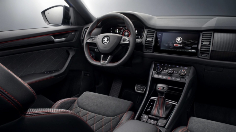 Салон Skoda Kodiaq RS получил новые сиденья (с интегрированными подголовниками, плюс сделаны они из замши), скошенный руль и алюминиевые накладки на педалях. Виртуальная приборная панель при этом обзавелась дополнительным спортивным режимом – в нем спидометр и тахометр выводятся на центр экрана. Также акустику кроссовера дополнили “плюшкой” Dynamic Sound Boost, добавляющей рык мотор через динамики – для пущей остроты ощущений.