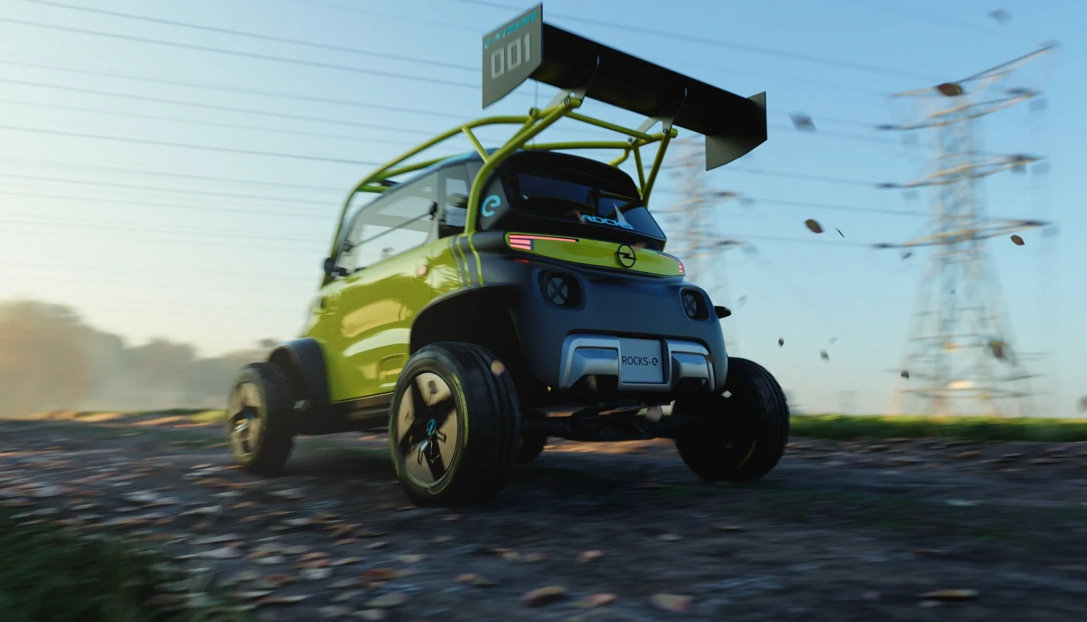 Варто відзначити, що у версії дизайнера мініатюрний Opel Rocks виглядає як справжній монстр ралі-кросу. Перше, що впадає у око — величезне антикрило на даху, встановлене на сталевих дугах. У передній частині каркасу видно дві додаткові рампи. Також у електромобіля збільшений дорожній просвіт та розширені колісні арки, під якими встановлені «зубасті» позашляхові шини.