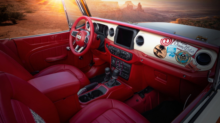 Натхненний класичним Jeepster 1968 року випуску, концептуальний рестомод Beach отримав квадратну решітку радіатора з вертикальними ламелями, круглі головні фари і стильний салон, оздоблений червоною шкірою. Такий яскравий відтінок чудово поєднується з глибоким бронзовим кольором кузова. У рух позашляховик приводить 2,0-літровий бензиновий турбодвигун на 240 к.с.