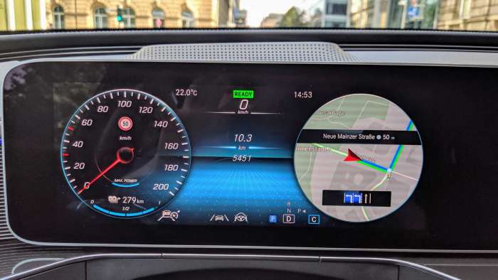 Розгін за 4,9 с до 100 км/год — прекрасний показник, але динамічний набір швидкості відбувається з ледь помітною затримкою. Автор допускає, що це може бути особливістю конкретного тестового екземпляра. Але, як ви розумієте, з 408-сильною силовою установкою повільним Mercedes EQC не назвеш. Окрема розмова — комфорт. Навіть на мощених вулицях Франкфурта підвіска продемонструвала гідну роботу.