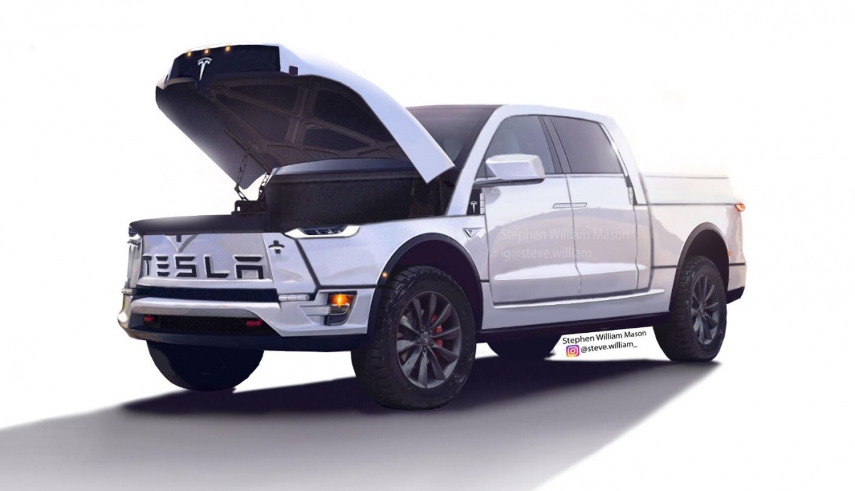 Также демонстрируем вам интересный любительский рендер, который изображает необычный облик новой модели. В первую очередь внимание привлекает брутальный дизайн с высоким кузовом и огромной надписью Tesla на носу. Очень по-американски! Главной же деталью стало огромное багажное отделение спереди, которое, кроме прочего, открывает доступ к удобной скамье.