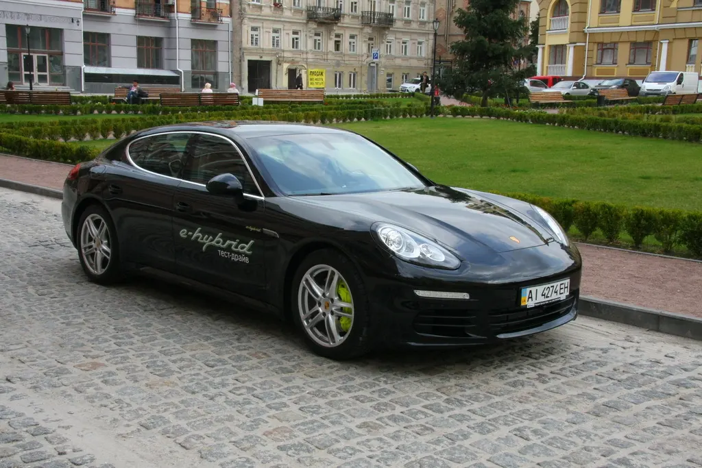 Машина для теста досталась нам самым первым в Украине! И это первая Panamera 2014 модельного года в нашей стране. И, если вам кажется, что она не отличается от машин, достаточно широко известных, и в большом количестве встречающихся на наших дорогах, то присмотритесь. Бамперы, капот, пороги, оптика, заднее стекло – все другое. Но, самое главное, что на машине не случайно подложка под шильдиками и тормозные суппорта окрашены кислотно-зеленым цветом Acid Green. По этим особенностям вы сразу узнаете, что под кузовом скрывается новейшая гибридная система plug-in. То есть это не привычный нам гибрид, а подзаряжаемый от внешнего источника тока!