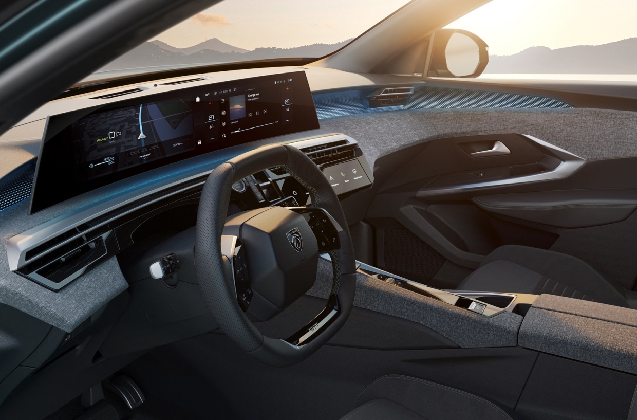 Незважаючи на компактні габарити — 4540 х 1890 х 1640 мм при колісній базі 2739 мм — новинка обіцяє просторий салон та багажне відділення на 520 літрів. Внутрішній простір організований у новій концепції PEUGEOT Panoramic i-Cockpit. Майже всю передню панель займає вигнутий 21-дюймовий екран. Перед водієм нове компактне рульове колесо з усіченими верхньою та нижньою секціями. Сенсорні кнопки в центрі передньої панелі можна налаштувати для швидкого доступу (до 10 функцій). Джойстик керування автоматичною коробкою передач розташований праворуч від керма, поруч із кнопкою зупинки/запуску двигуна.