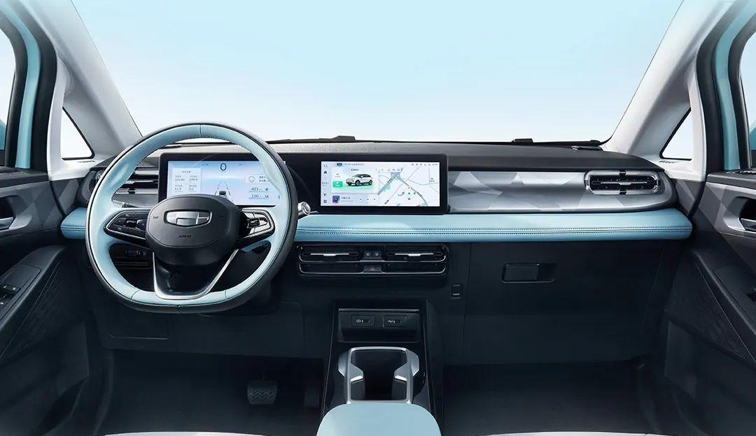 З конвеєра новий Geely Geometry E Firefly укомплектований світлодіодними фарами Firefly Eye та «розкішною електронною коробкою передач». У салоні — два об’єднані в один блок 10,25-дюймові дисплеї «високої чіткості» (панель приладів та мультимедійна система).