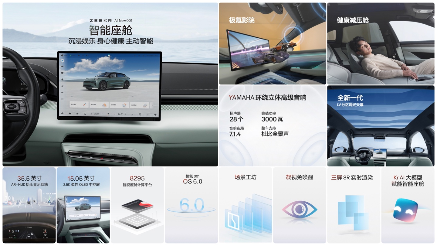 Зі зміною покоління Zeekr 001 переїхав на 800-вольтову архітектуру. Усі версії моделі стандартно комплектуються лідаром та акустичною системою Yamaha формату 7.1.14 з підтримкою Dolby Atmos та 28 динаміками. Також в наявності 35,5-дюймовий проєкційний дисплей AR-HUD, підтримка супутникового зв’язку, РК-панель приладів та 15,05-дюймовий дисплей мультимедійної системи. Роботу електроніки забезпечує чіп Qualcomm Snapdragon 8295 та операційна система ZEEKR OS 6.0.