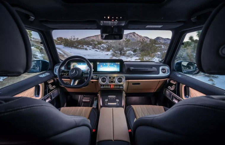 У салоні культового позашляховика з'явилося нове рульове колесо та покращена мультимедійна система MBUX. Також оновлений G-Wagen обзавівся слотом для бездротової зарядки смартфона, покращеними камерами кругового огляду, що дають змогу дивитися «крізь капот», розважальною системою для задніх пасажирів з 11,6-дюймовими екранами та підсклянниками з підігрівом.