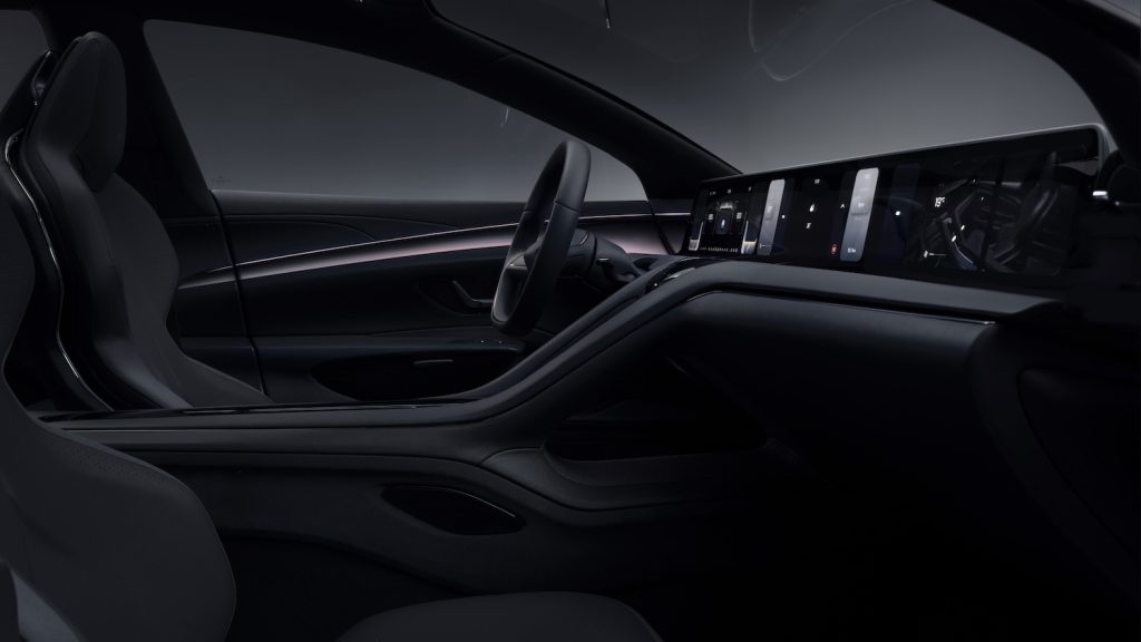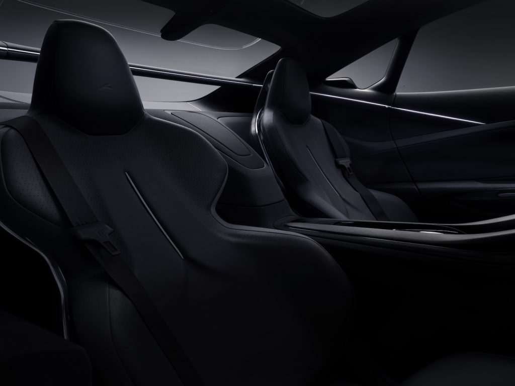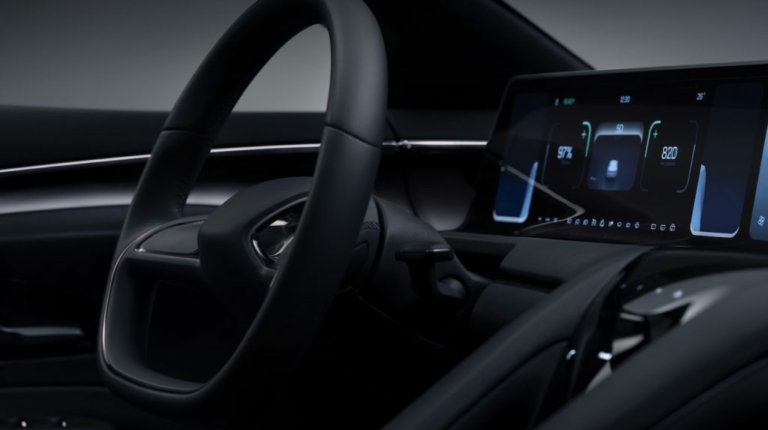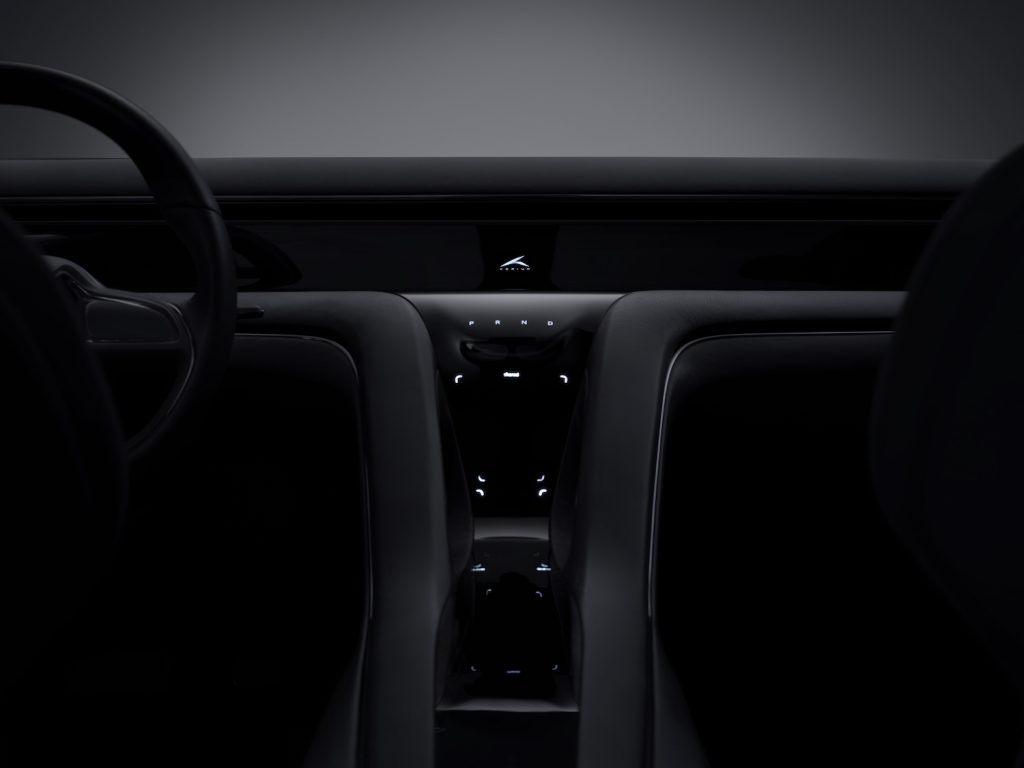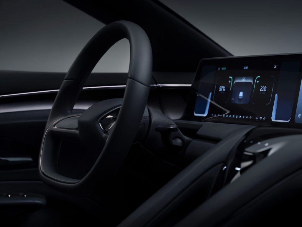 Як видно на фото, всю передню панель займає широкоформатний дисплей із тактильним відгуком. Перед водієм “вінтажне” двоспицеве кермове колесо. Між ним і переднім пасажиром — “летюча” центральна консоль, що закінчується між сидіннями другого ряду. Зовні передні і задні сидіння нагадують спортивні “ковші” з інтегрованими підголівниками. В оздобленні інтер’єр обіцяють використовувати високоякісні та екологічні чисті матеріали від європейських виробників.
