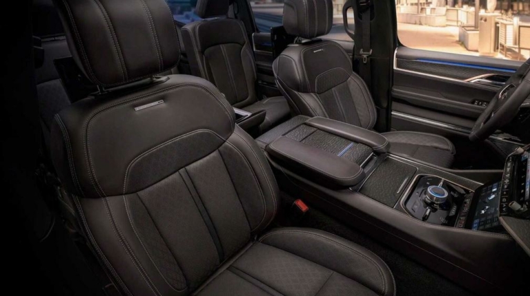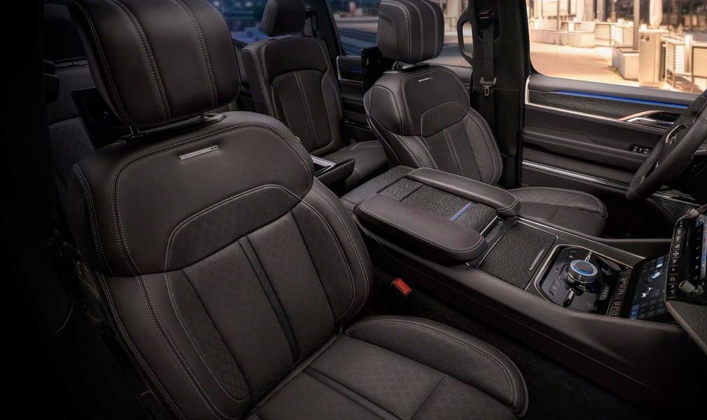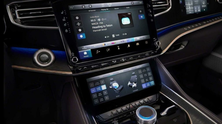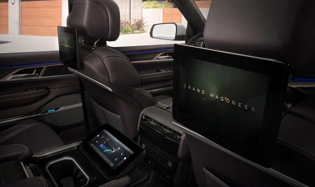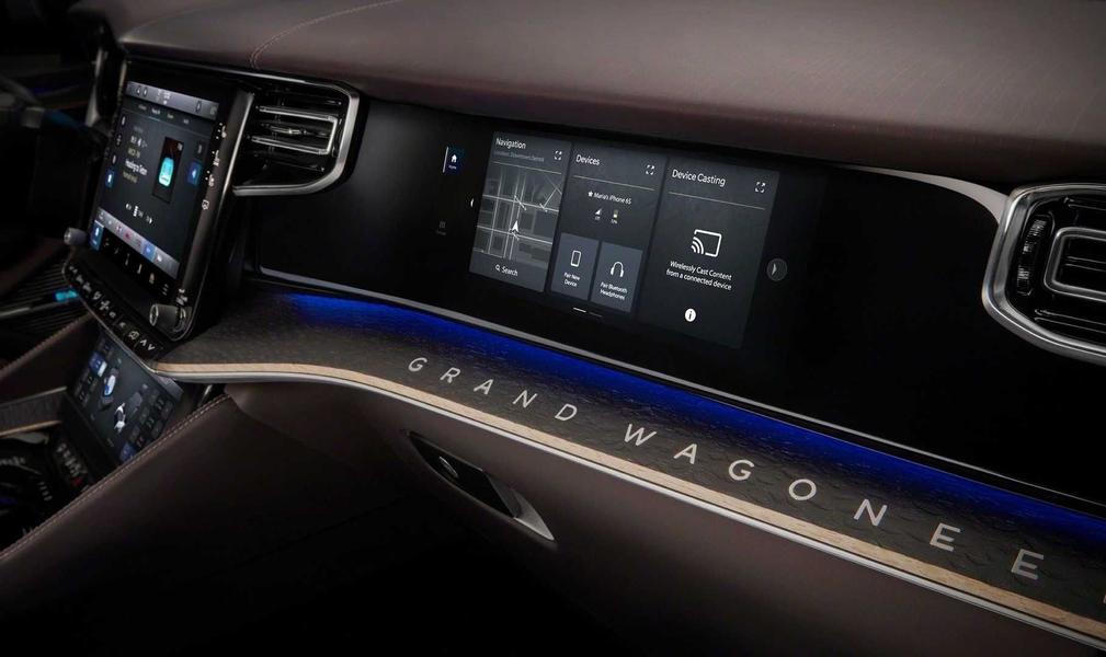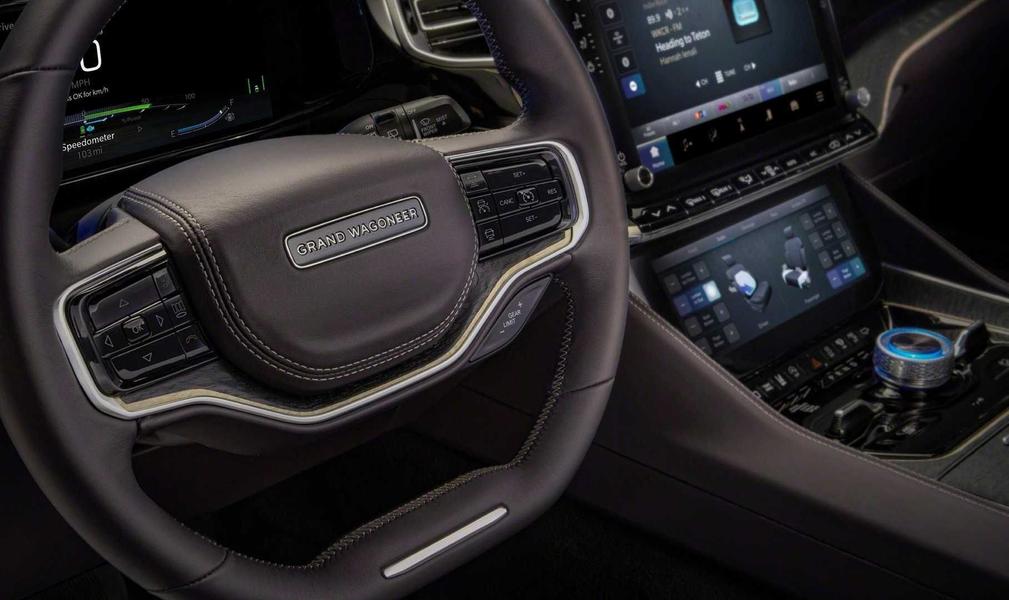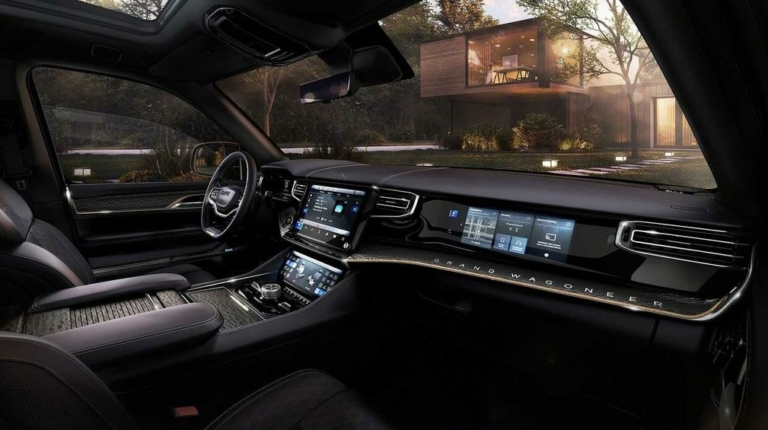 Салон Jeep Grand Wagoneer 2021 повністю відповідає його зовнішності та статусу. Виробник використовував дорогі матеріали оздоблення, а саме замшу і дерев’яний шпон. В око впадає шайба селектора передач, що замінила традиційний важіль, і безліч дисплеїв.