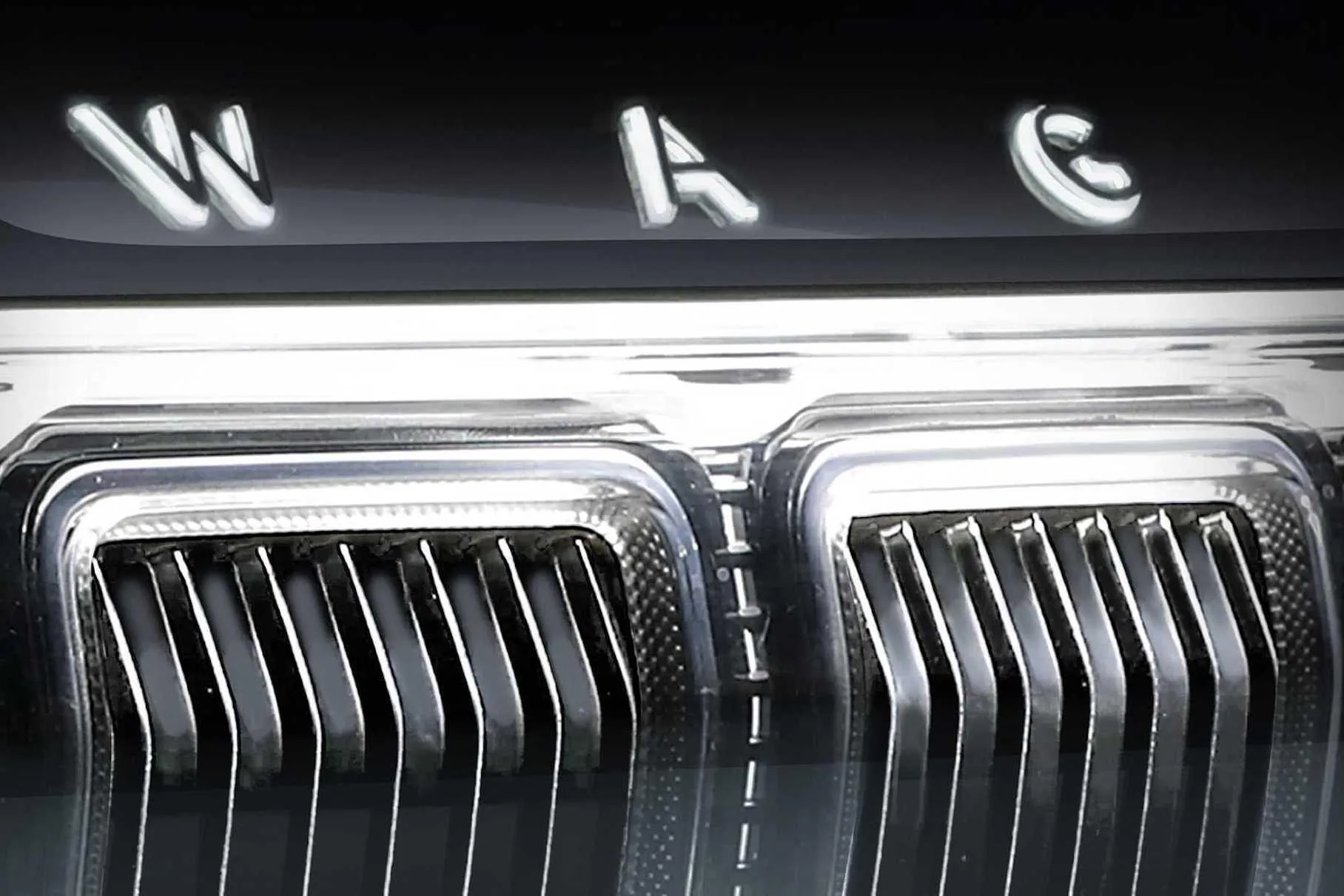 Автомобиль уже полностью готов к премьере, поэтому для подогрева интереса производитель продолжает показывать нам некоторые детали дизайна. На этот раз – фрагмент передней части кузова с решеткой и названием модели Wagoneer прям на капоте. Судя по всему, буквы умеют светиться.