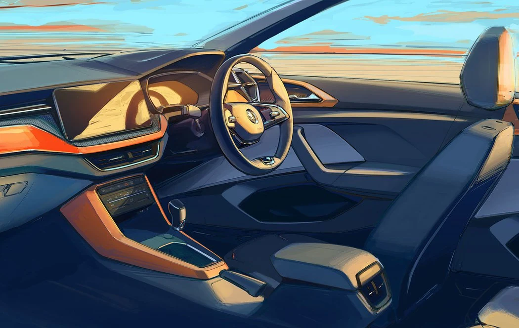 А зараз з'явилася свіжа партія ескізів — цього разу показали салон Skoda Kushaq. Як і інші моделі виробника, бюджетний кросовер зможе запропонувати великий інформаційно-розважальний дисплей мультимедіа. Його діагональ становитиме до 10 дюймів. Судячи з ескізу, в салоні з'явиться і цифрова приладова панель. Особливий інтерес викликає зона під дефлекторами вентиляції. Найімовірніше, там встановлена сенсорна панель, яка прийде на зміну звичним кнопкам.