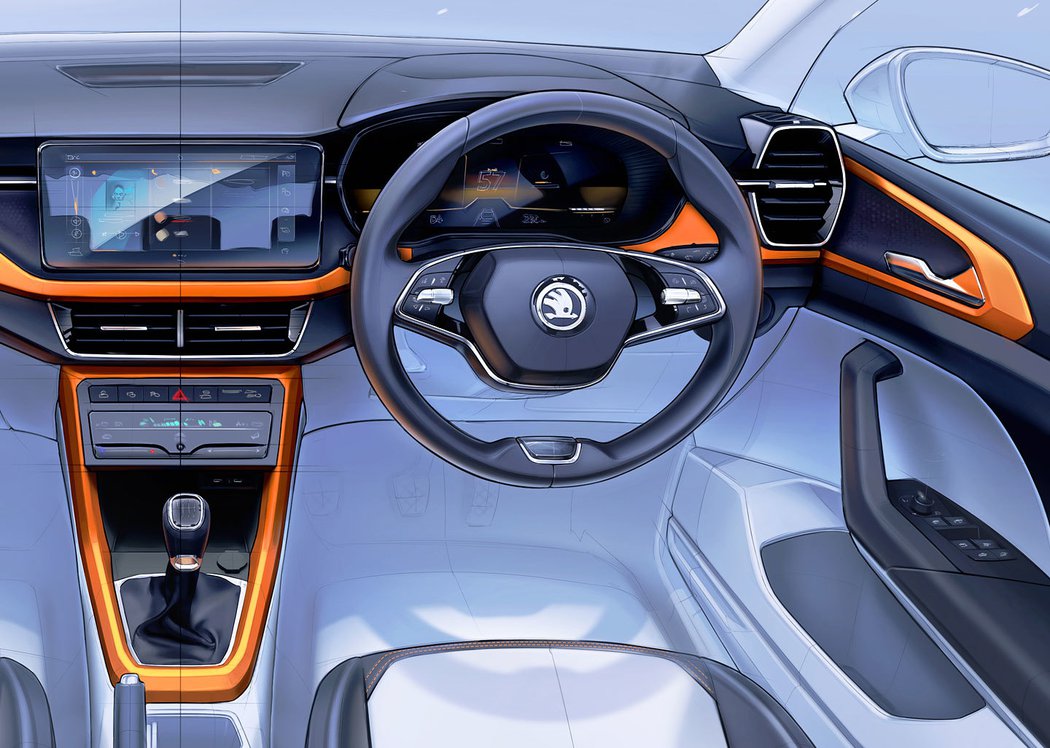 А зараз з’явилася свіжа партія ескізів — цього разу показали салон Skoda Kushaq. Як і інші моделі виробника, бюджетний кросовер зможе запропонувати великий інформаційно-розважальний дисплей мультимедіа. Його діагональ становитиме до 10 дюймів. Судячи з ескізу, в салоні з’явиться і цифрова приладова панель. Особливий інтерес викликає зона під дефлекторами вентиляції. Найімовірніше, там встановлена сенсорна панель, яка прийде на зміну звичним кнопкам.
