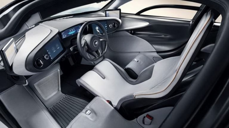 Как и McLaren F1, новое купе является трехместным. Кресло водителя размещено по центру, а пассажирские сиденья – по бокам. Виртуальная приборка соседствует с двумя большими дисплеями.