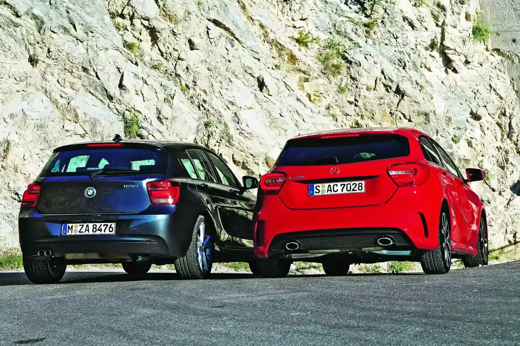 Так же громогласен Mercedes, пробивающий брешь для нового А-класса. «Спортсмен среди компактов!» «Самый сенсационный автомобиль!» Но если без преувеличений, то перед нами предстает обычный пятидверник, силуэт которого, если прищурить глаза, очень напоминает 1-ю серию. Еще никогда благородные компакты не были так похожи. Теперь снова широко раскроем глаза. Стоящий перед нами A 250 Sport готов к первому сравнительному тесту с 125i, который после фейслифтинга стал более подтянутым, но уже не таким возбуждающим. BMW утихомирился, тогда как внешность Mercedes’а будоражит умы. Грубо говоря, BMW повторяет ошибку первой «единички», которую дразнили вьетнамской свинкой с обвисшим брюшком, когда она впервые появилась в 2004 году.