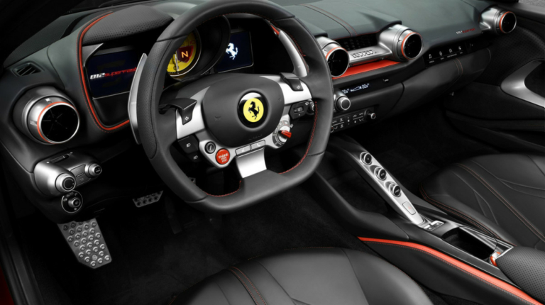 Інтер’єр Феррарі також повністю новий. На приладовій панелі поєднуються великий циферблат тахометра і два рідкокристалічних дисплеї. Встановлено і кермо з плоским ободом знизу, запозичений у Ferrari GTC4 Lusso.