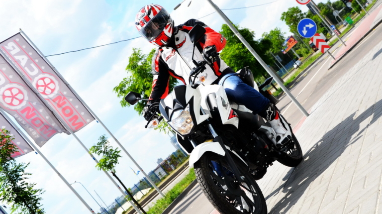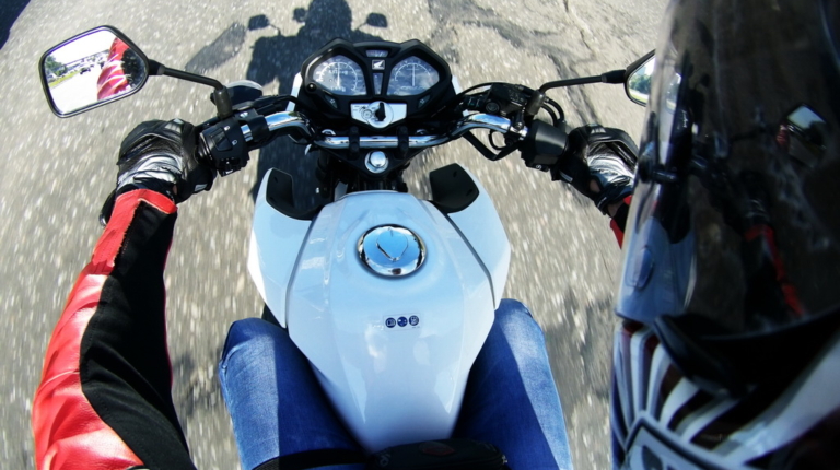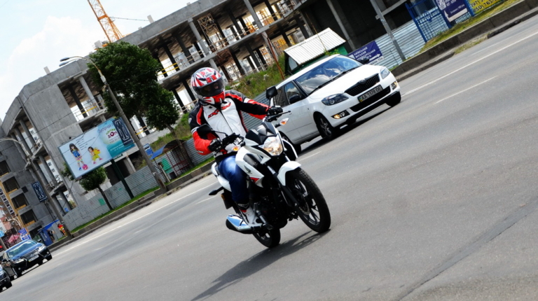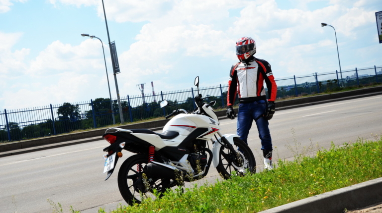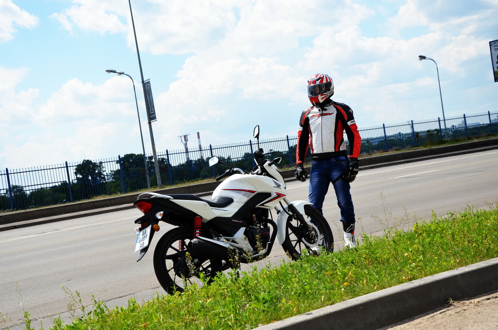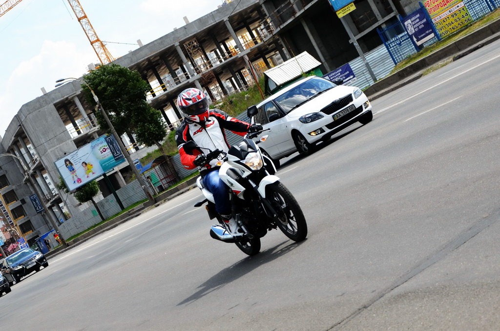 Відзначу цікаву особливість мотоцикла. Сукупність динаміки і маси перетворюють їзду в веселий атракціон. Стрілка тахометра то злітає вгору прагнучи до червоної зони, то падає вниз. Двигун доволі еластичний, але щоб почуватися впевнено в щільному потоці машин доводиться активно працювати газом і лапкою перемикання передач, що, втім, не викликає ніякого дискомфорту. Зазвичай їзда навіть у відносно вільному місті для досвідченого райдера – задоволення сумнівне, але Хонда CB125F мене радує, підвіска в комплекті з литими колесами вісімнадцятого радіусу добре справляється з міськими напливами і ямами, краями, і тротуарами. Я без проблем пересуваюся у заторах і можу запаркуватися де завгодно – чи то у центрі, чи в спальному районі.