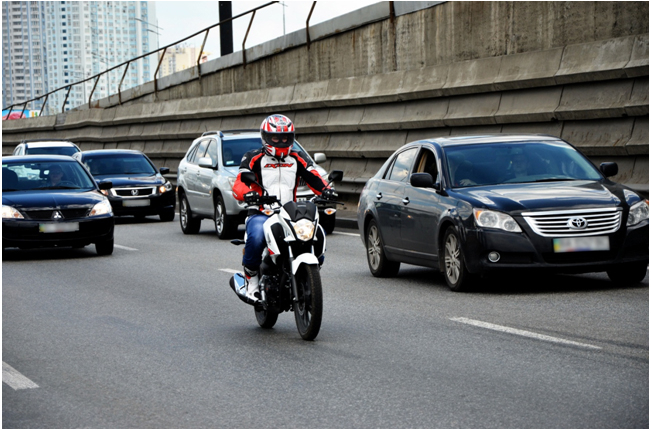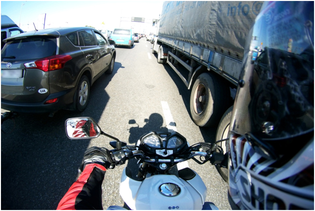 Але повернемося до початку сьогоднішнього дня. Заправивши повний бак, виїжджаю на Велику Окружну дорогу. Від Вишневого в бік Жулян все стоїть, звісно, на мене чекає міжряддя. Габарити Honda CB125F становлять 2035х765х1080 мм і дають змогу мотоциклу легко рухатися навіть за умови завантаженого трафіку. Поступово моя швидкість зростає з 20 до 40 км/год, тут варто притримати себе, адже маневрування обмежене. Та й деякі водії авто спеціально вирулювати так, що доводиться збавляти, об’їжджаючи машини мало не торкаючись бамперів. По дорозі в заторі зустрічаються самотні сумні чопперисти, їм важко і некомфортно.