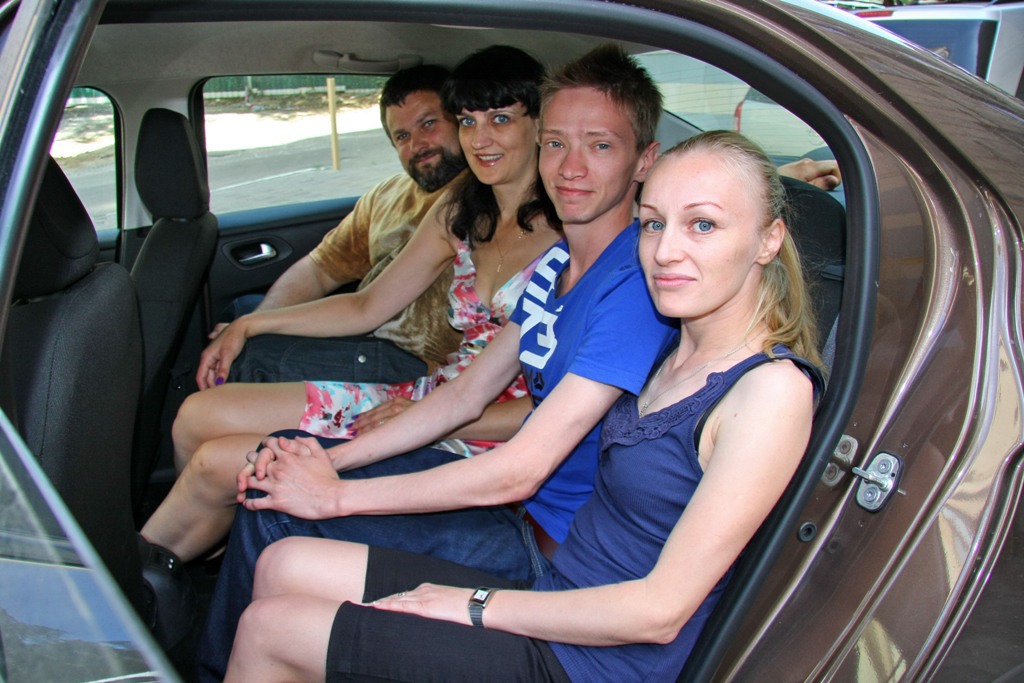 А теперь еще один эксперимент – все четверо наших сотрудников садятся на заднее сидение (перевозить так людей в машине запрещено ПДД, но они никуда не ездили). В результате все поместились, и когда обе двери были закрыты, никто сильно не жаловались на тесноту. Тест пройден!