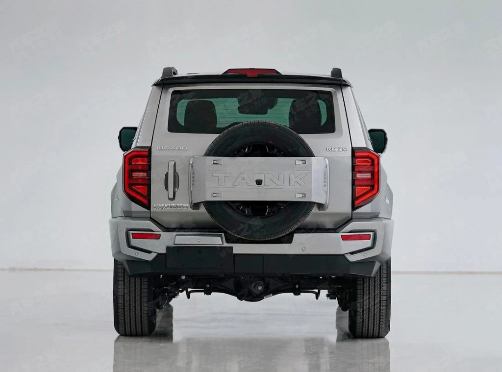 На нових знімках товарна версія позашляховика. Зовні Tank 400 виглядає так само «суворо», як і більшість автомобілів цього класу. У нього жорсткі лінії кузова, масивні бампери, широкі колісні арки та запасне колесо на багажних дверях. Прямий дах закінчується невеликим спортивним спойлером. На кормі привертають увагу вертикальні прямокутні ліхтарі та логотип «Great Wall Tank Off-Road».