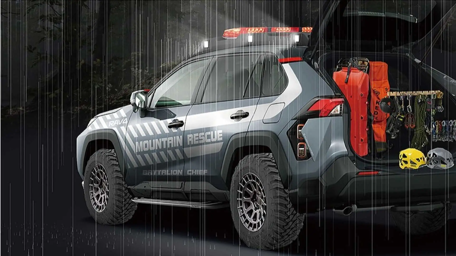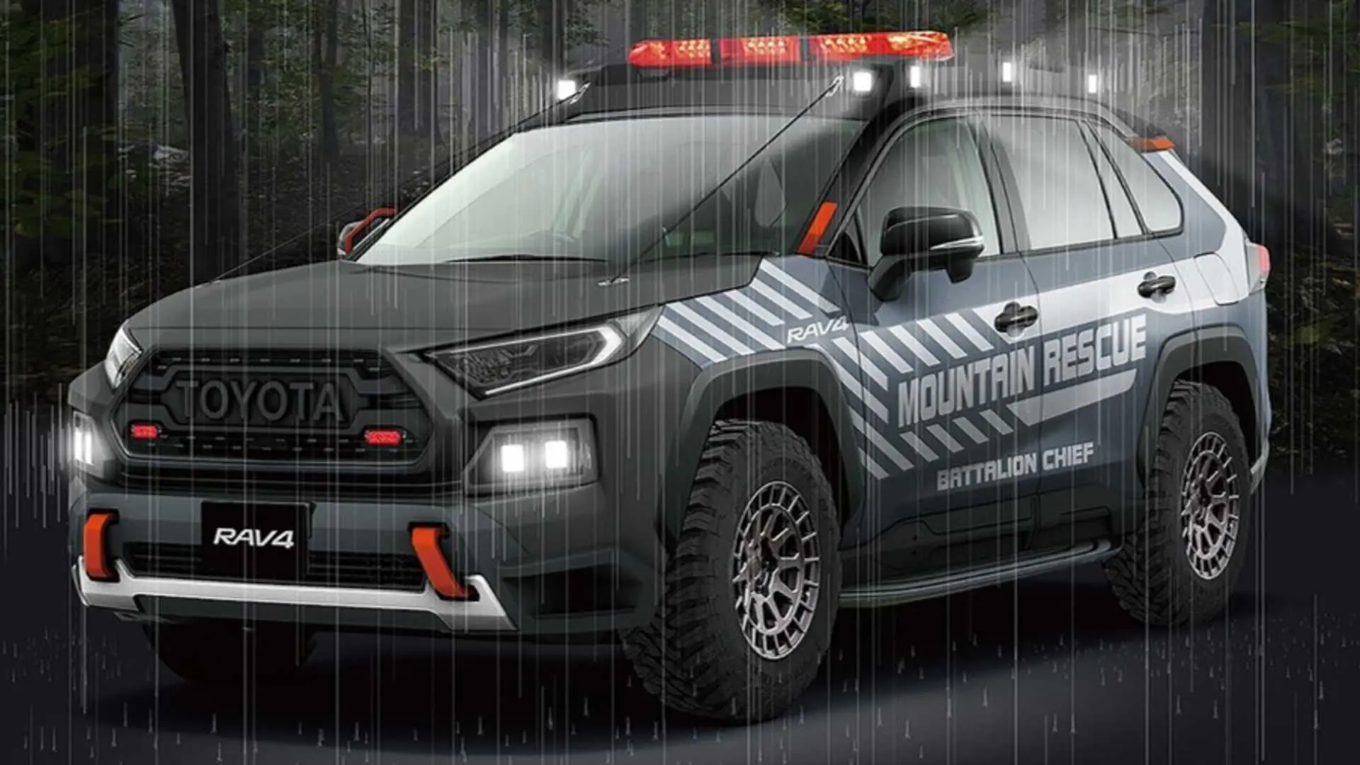 Крім цього, для підвищення прохідності новому РАВ 4 збільшили дорожній просвіт і додали великі колеса з позашляховою гумою. Автомобіль отримав все необхідне оснащення для проведення рятувальних робіт.