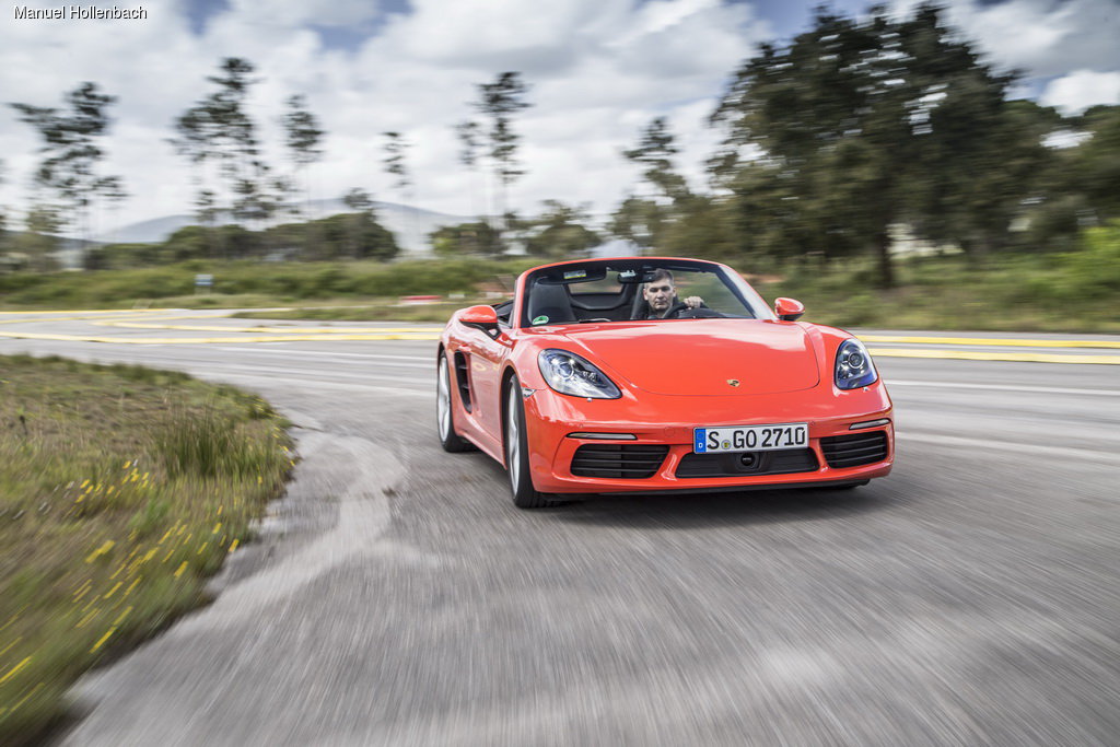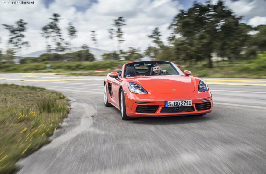 Но она оказалась не такой уж и серой, когда я увидел шеренгу родстеров в пяти новых цветах. Все – Porsche 718 Boxster S. Это значит, что за спинками сидений установлены 2,5-литровые оппозитные турбомоторы, развивающие 350 л.с. и 420 Нм. А ведь это уникальный двигатель. На нем установлена турбина с изменяемой геометрией (как на дизельных моторах).